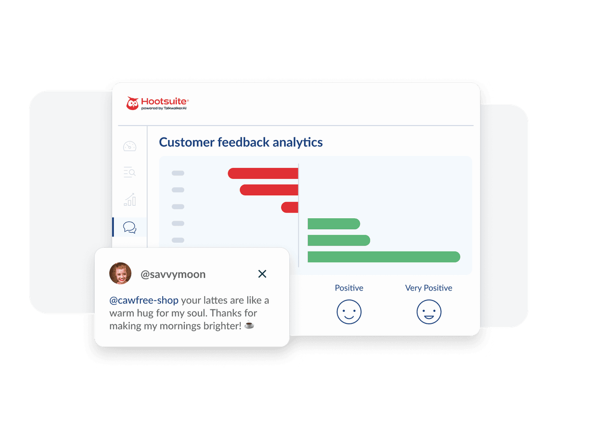 Protect your brand’s reputation effortlessly with real-time mention alerts, review management, and proactive sentiment tracking. It’s all in Hootsuite powered by Talkwalker AI.